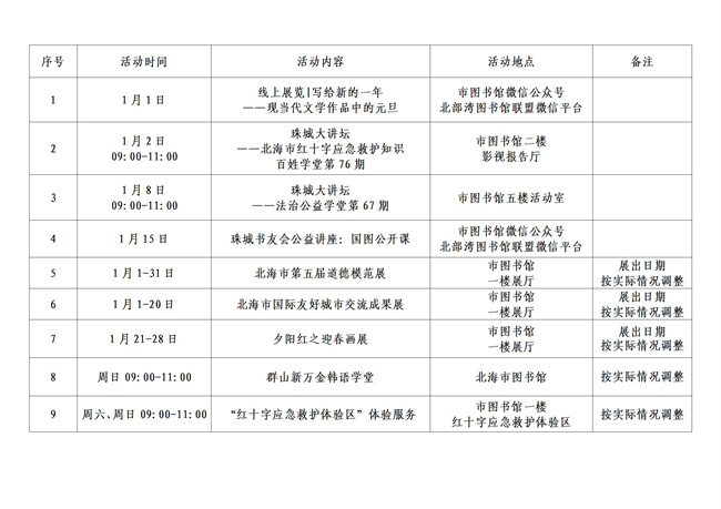 北海市图书馆2022年1月活动开展安排表