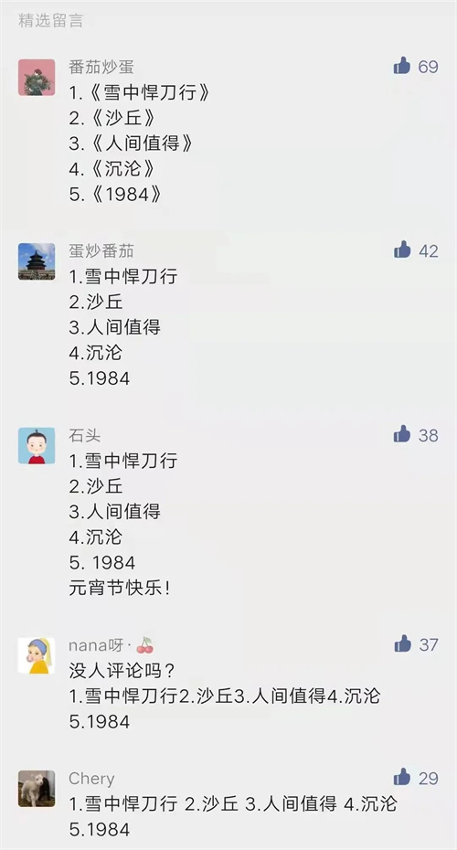 北海市图书馆联合QQ阅读、懒人畅听推出的“喜闹元宵 猜书赢奖”主题活动已圆满结束!本次活动浏览量高达587次,收到猜书答卷157份,感谢读者们的参与!本次活动的猜书答案是:1.《雪中悍刀行》2.《沙丘》 3.《人间值得》 4.《沉沦》 5.《1984》