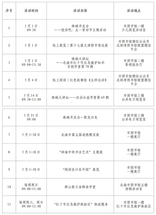 北海市图书馆2022年5月活动开展安排表