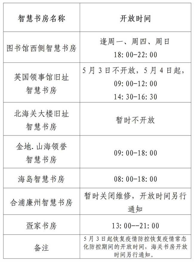 按照当前的疫情防控情况,北海市图书馆和部分城市智慧书房将于5月3日(周二)起正式恢复开放,暂不举办所有线下文化活动。开馆期间我馆将严格履行疫情防控主题责任,严格落实馆内各项防控措施,具体开放部室、部分城市智慧书房及开放事宜通知如下: