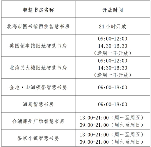 根据我市疫情防控实际情况,北海市图书馆城市智慧书房将于9月11日(周日)起恢复开放,具体开放时间如下: