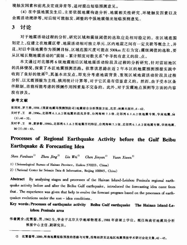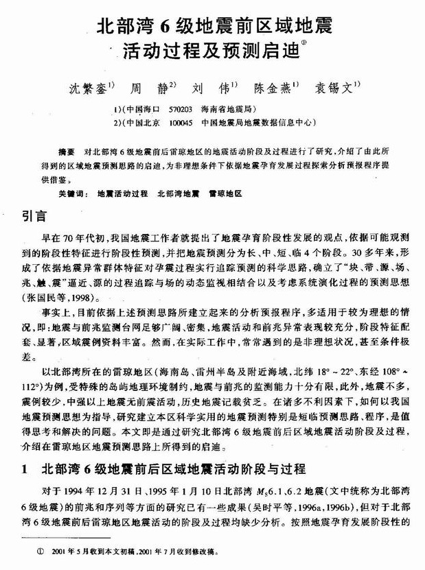 北部湾6级地震前区域地震活动过程及预测启迪