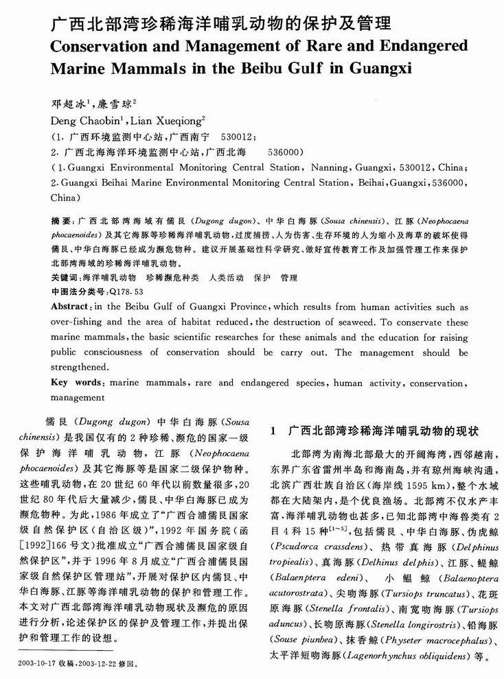 广西北部湾珍稀海洋哺乳动物的保护及管理