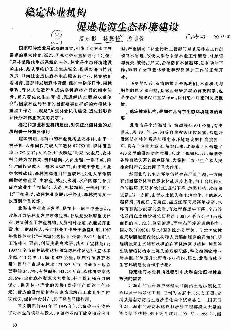 稳定林业机构促进北海生态环境建设