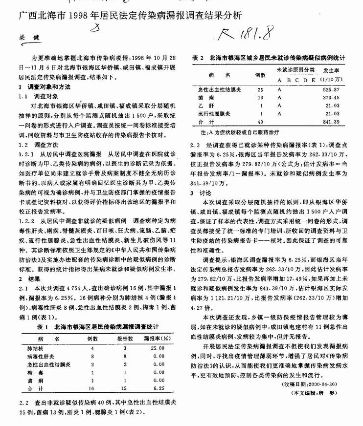 广西北海市1998年居民法定传染病漏报调查结果分析