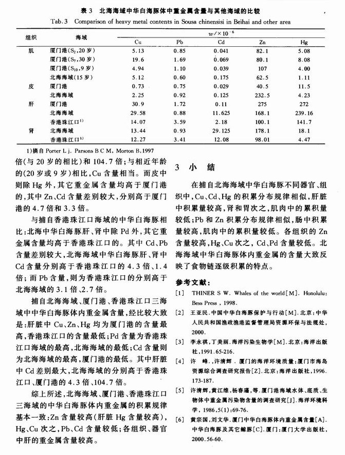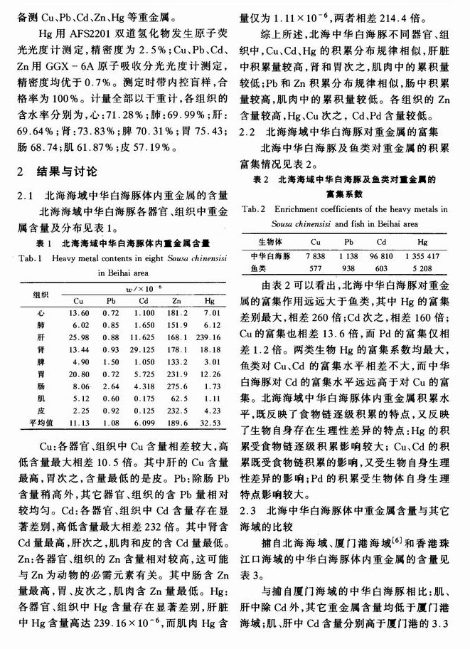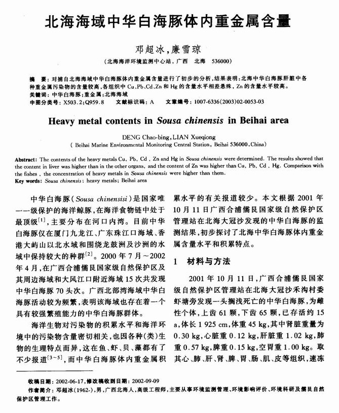 北海海域中华白海豚体内重金属含量