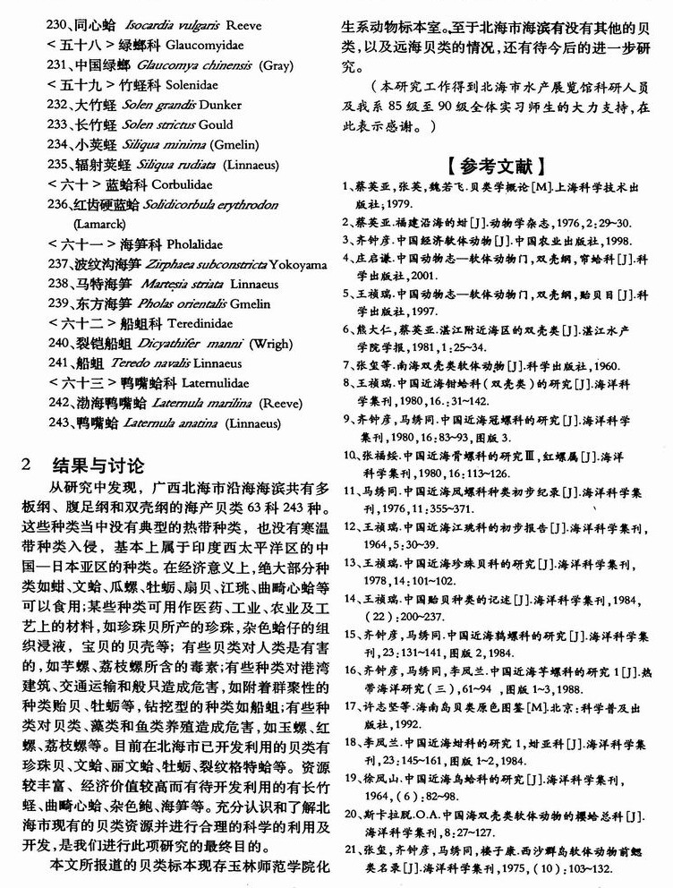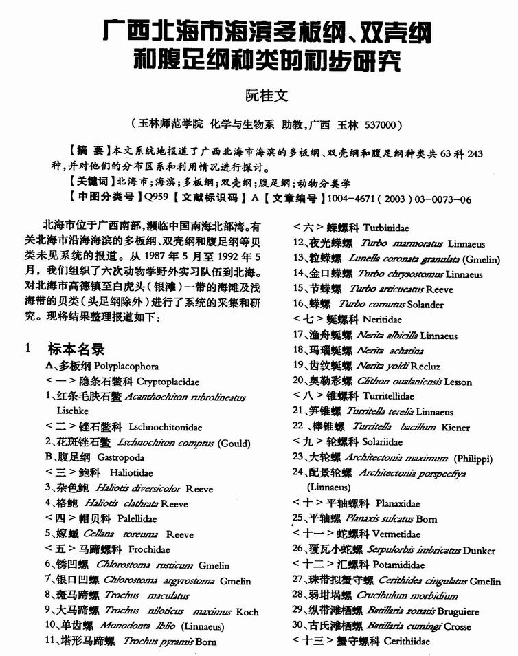 广西北海市海滨多板纲、双壳纲和腹足纲种类的初步研究