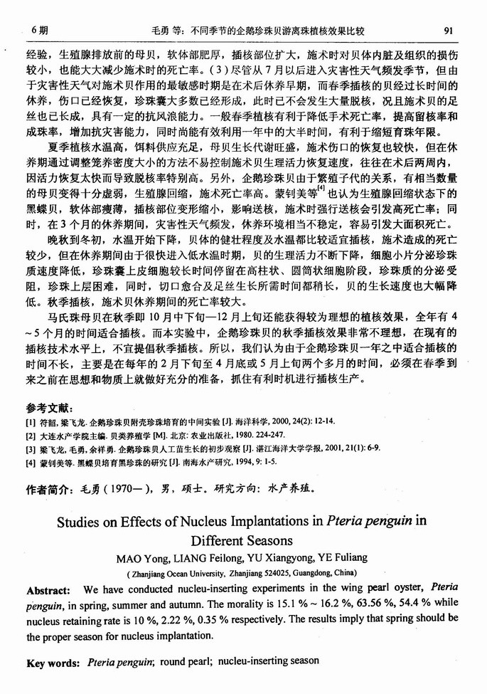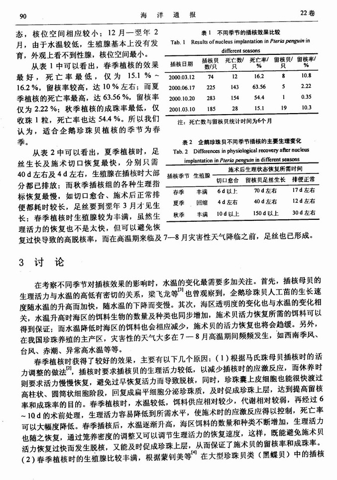不同季节的企鹅珍珠贝游离珠植核效果比较