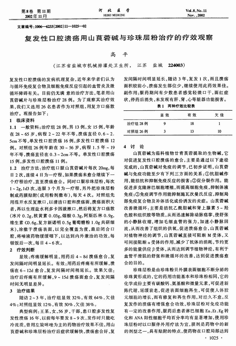 复发性口腔溃疡用山茛菪碱与珍珠层粉治疗的疗效观察