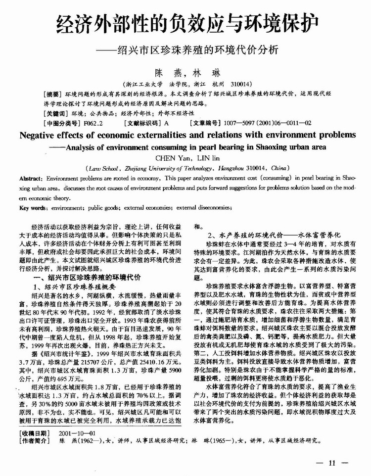 经济外部性的负效应与环境保护:绍兴市区珍珠养殖的环境代价分析