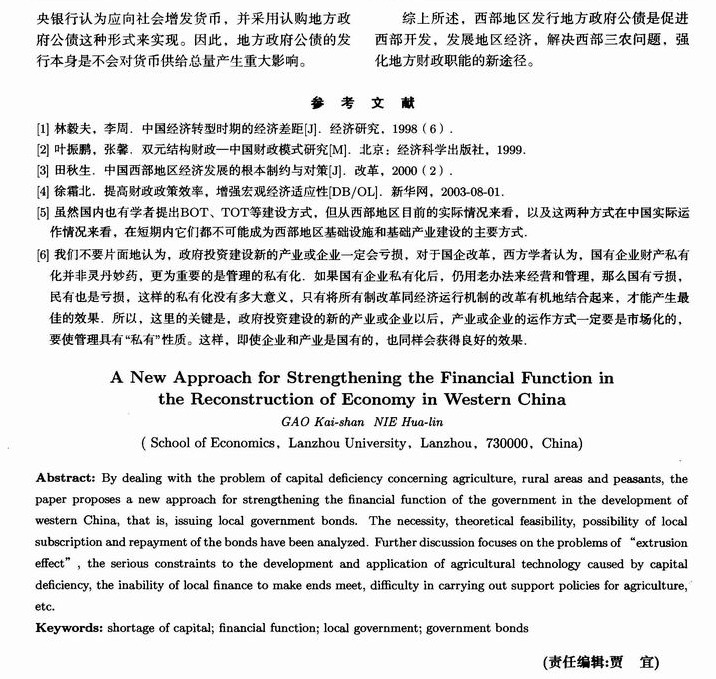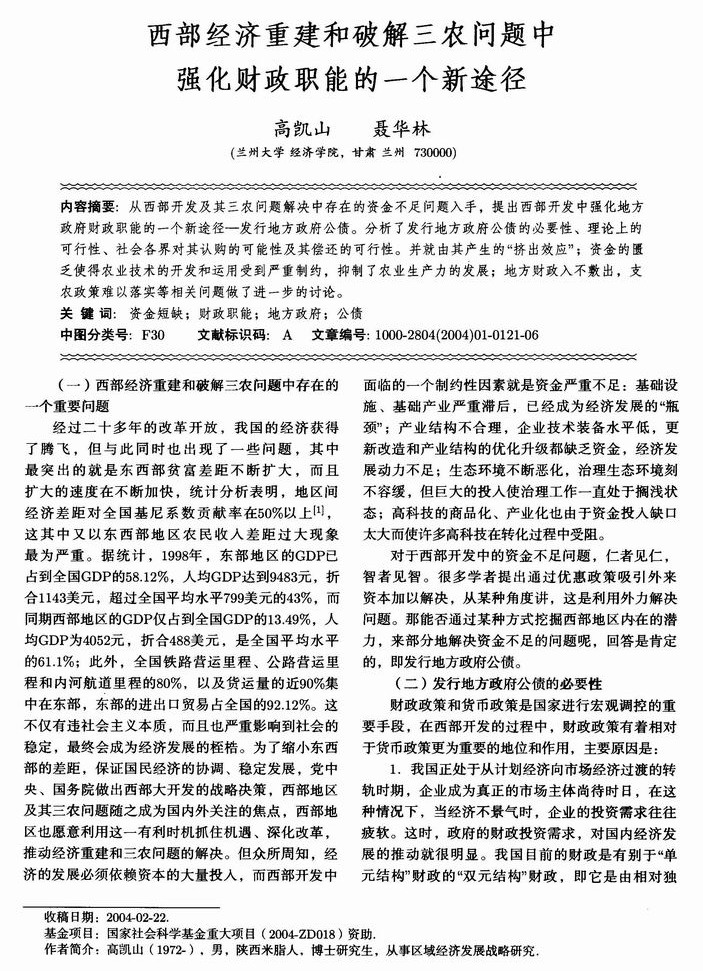 西部经济重建和破解三农问题中强化财政职能的一个新途径