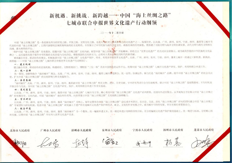《新机遇、新挑战、新跨越——中国“海上丝绸之路”七城市联合申报世界文化遗产行动纲领》原件