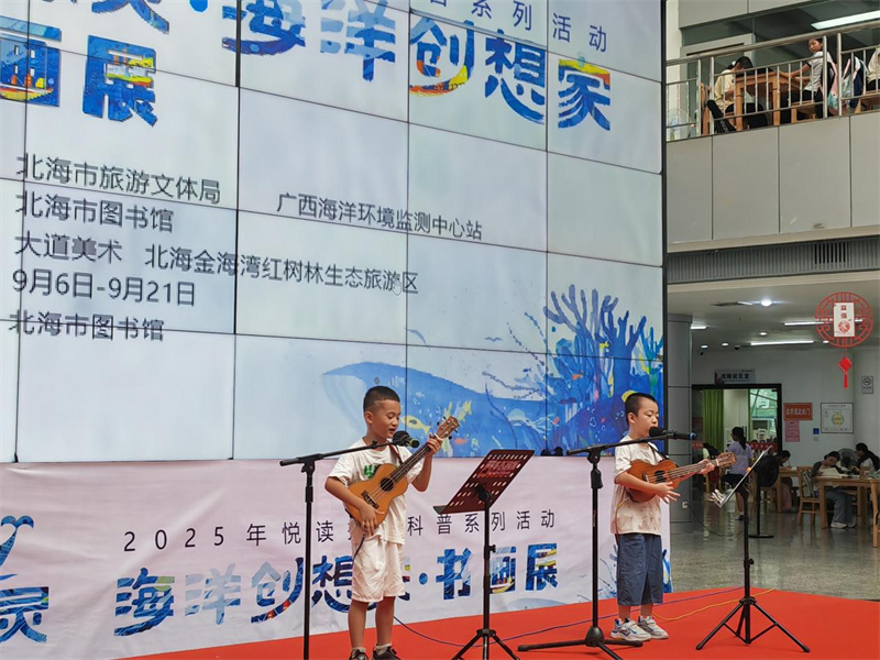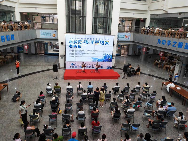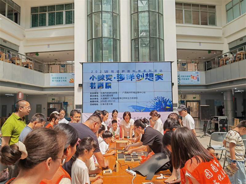 9月6日,由北海市旅游文体局、广西海洋环境监测中心站主办,北海市图书馆承办,大道美术、北海金海湾红树林生态旅游区协办的“小鲸灵·海洋创想家书画展”主题活动,在北海市图书馆一楼温情启幕。该活动依托北海本土海洋文化,是2025年“悦读护苗”科普系列活动的重要组成部分,以传递海洋保护理念、深化海洋科普与跨学科教育、推动教育与文旅融合为核心,通过才艺展演、知识讲解、手工创作与书画赏析等多元形式,将海洋文化之美与生态保护理念深度结合;同时以青少年海洋主题作品为核心,同步推进作品文创化,打造“艺术+海洋+教育”特色平台,为市民朋友们打造了一场兼具观赏性、趣味性与教育性的蓝色文化盛宴。