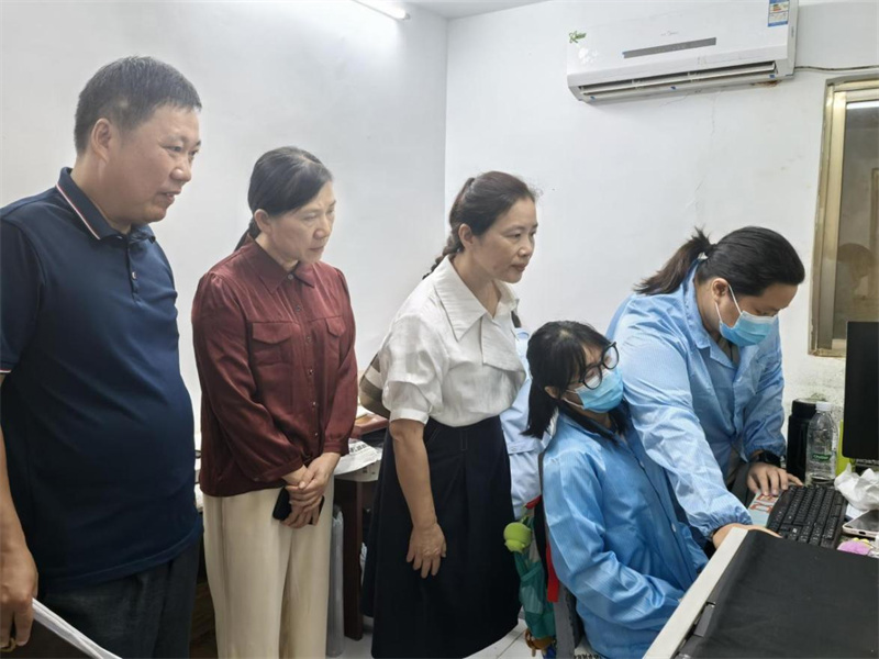 合浦县图书馆馆长庞辉庆陪同调研组参观该馆正在进行古籍数字化的工作室