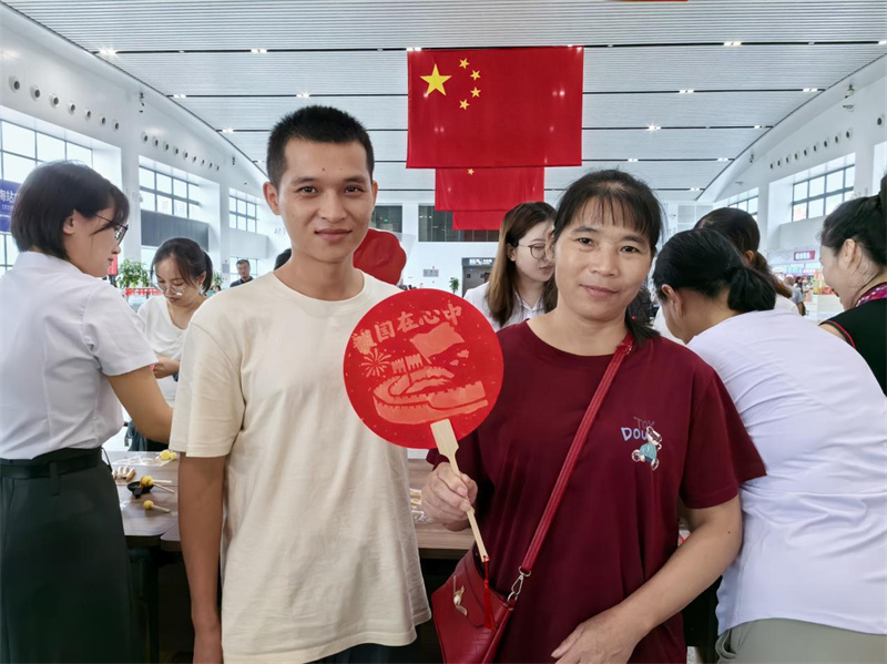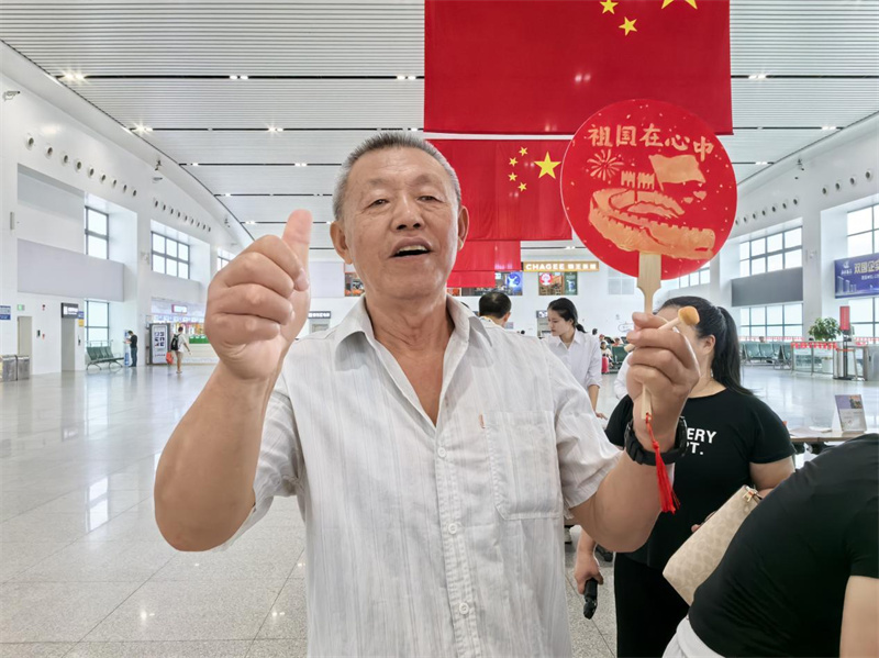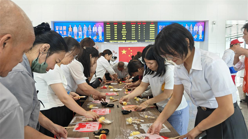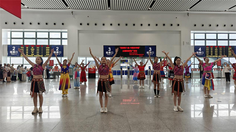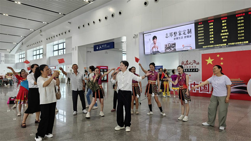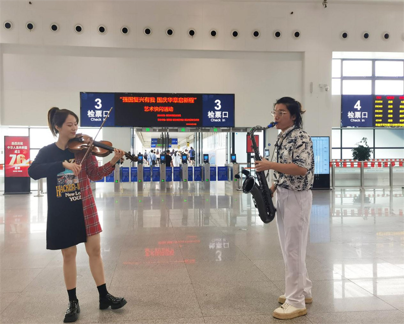 活动以充满活力的舞蹈拉开序幕,动作整齐灵动,每个舞姿皆饱含对祖国的热爱,瞬间点燃现场氛围,旅客纷纷驻足拍摄。随后,乐器演奏以欢快旋律传递节日喜悦,多种乐器默契配合奏响歌颂祖国的乐章。歌唱环节将现场气氛推向高潮,一首《我和我的祖国》响起,参与活动的旅客们挥舞着手中的小国旗,共同抒发赤子之心,浓浓的爱国情怀深深烙印在每一位在场者的心间。