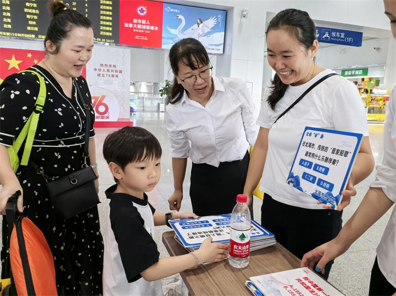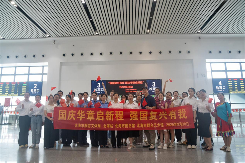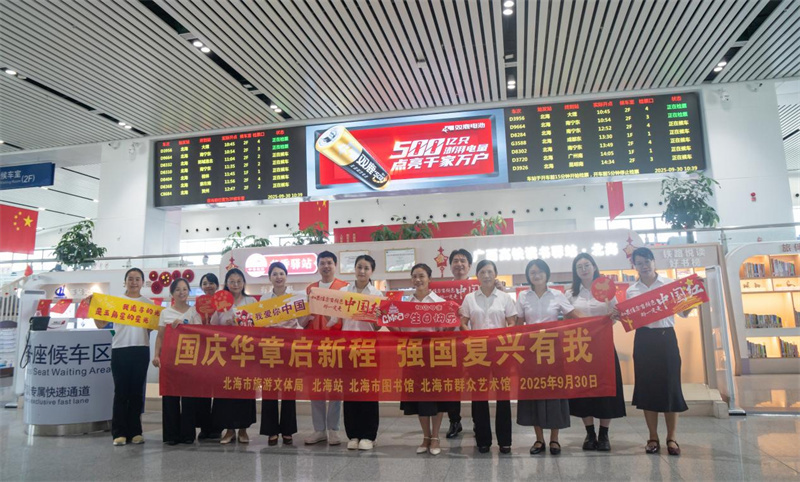 为庆祝新中国成立76周年,弘扬爱国主义精神,营造浓厚的节日书香氛围,2025年9月30日,由北海市旅游文体局主办,北海站、北海市图书馆、北海市群众艺术馆承办的“悦读享八桂 书香庆华诞”主题阅读推广活动在北海站二楼候车厅举行。活动现场热闹非凡,吸引了众多旅客参与。