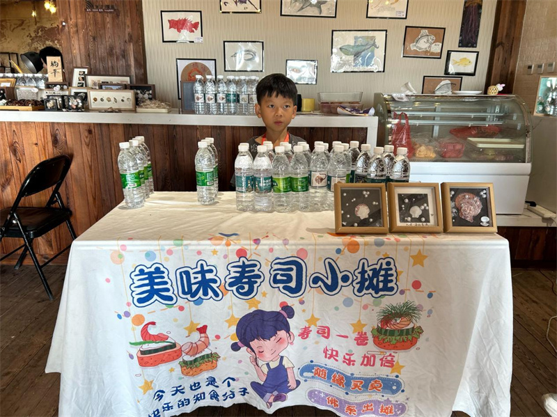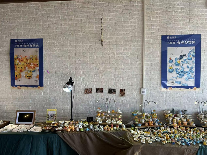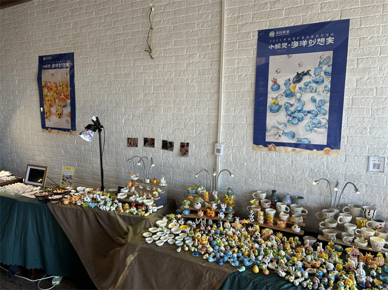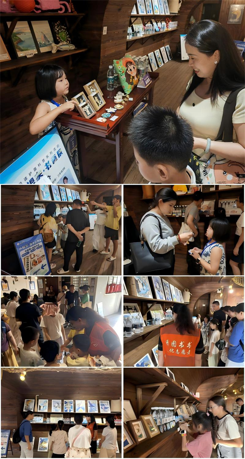 随后移步至风味文创区,这里的“小心思”让亲子家庭眼前一亮。文化志愿者早已备好印有孩童画作的矿泉水瓶打卡留念。在“小鲸灵掌柜”专区,大家观赏工艺美术大师的海洋工艺作品。在沉浸式体验中领悟传统绘画与手工创作的魅力,进一步深化对环保文化与文化传承创新表达的理解。