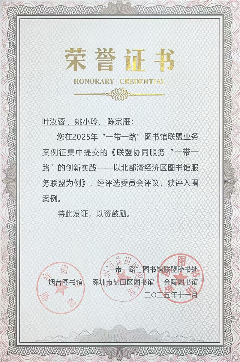 北海市图书馆已成为“一带一路”图书馆联盟的一员。该联盟历经十年发展,在促进文献互通、推动研究与文化传播方面作用显著。未来,我馆将积极依托联盟平台,与各成员深化务实合作,为促进“书香跨越山海,文化连接人心”贡献力量,共同书写联盟发展新篇章。
