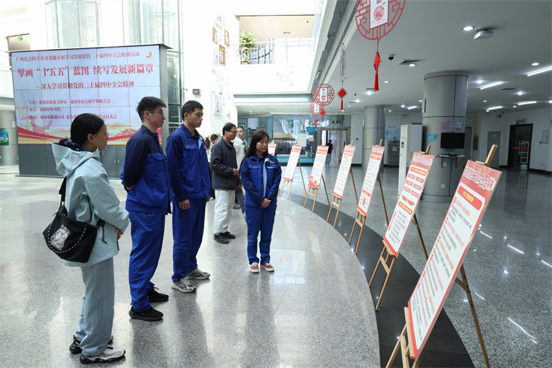 本次活动精心设置了丰富多样的阵地展示环节。在北海市图书馆圆厅,“学习贯彻党的二十届四中全会精神”主题展区格外引人注目。展区内的展板以图文并茂的形式展示了全会核心要义、重大部署、“十五五”规划宏伟蓝图等内容,吸引了众多参与者驻足观看、学习交流。