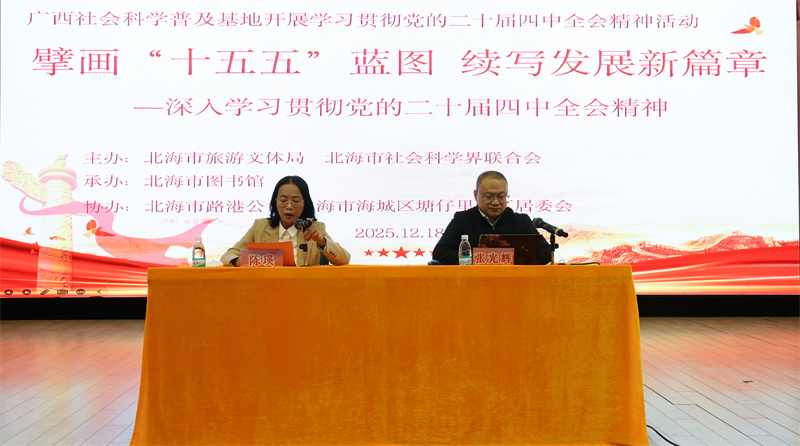 为深入学习贯彻党的二十届四中全会精神,切实把思想和行动统一到全会部署上来,充分发挥广西社会科学普及基地——北海市图书馆的宣传教育作用,2025年 12 月 18 日上午,由北海市旅游文体局、北海市社会科学界联合会主办、北海市图书馆承办,北海市路港公司、北海市海城区塘仔里社区居委会协办的“擘画‘十五五’蓝图 续写发展新篇章——深入学习贯彻党的二十届四中全会精神”宣讲活动在北海市图书馆二楼报告厅成功举办,相关的机关单位干部职工、市民读者约 200 人参与,取得了良好的宣传教育效果。