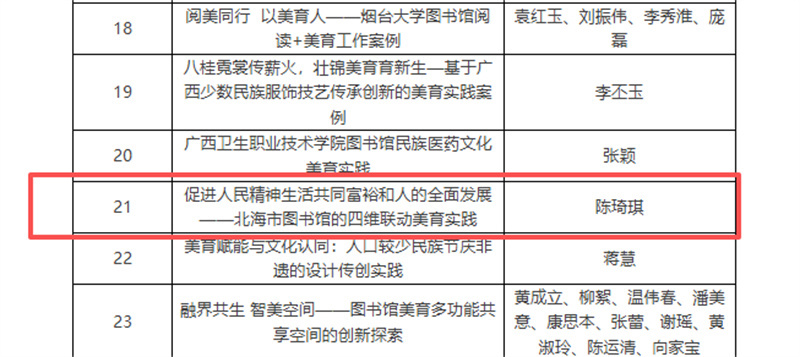 本次论坛的论文与案例征稿活动历时26天,涵盖公告征集、线下初评、入选公示、专家复评、论坛召集、现场宣布、大会宣读及线上通知等环节。活动共收到投稿论文、案例614件,经过专家多轮严格评审,最终评选出112件优秀论文、案例。我馆案例《促进人民精神生活共同富裕和人的全面发展——北海市图书馆的四维联动美育实践》荣获优秀案例,我馆馆员陈琦琪受邀参会并作主题分享。
