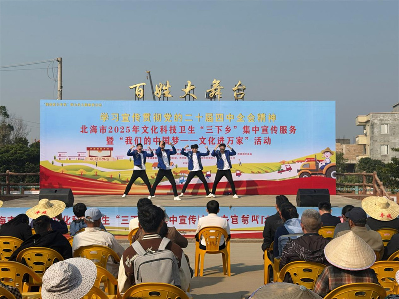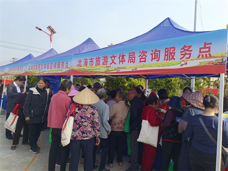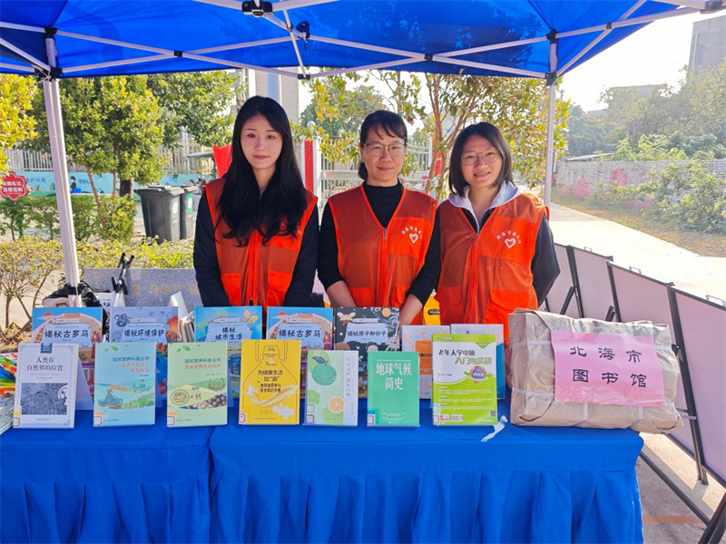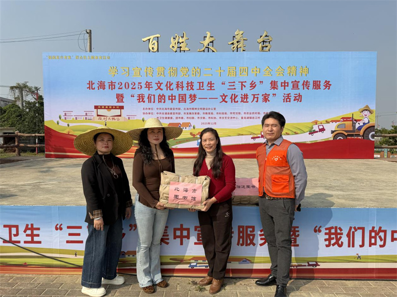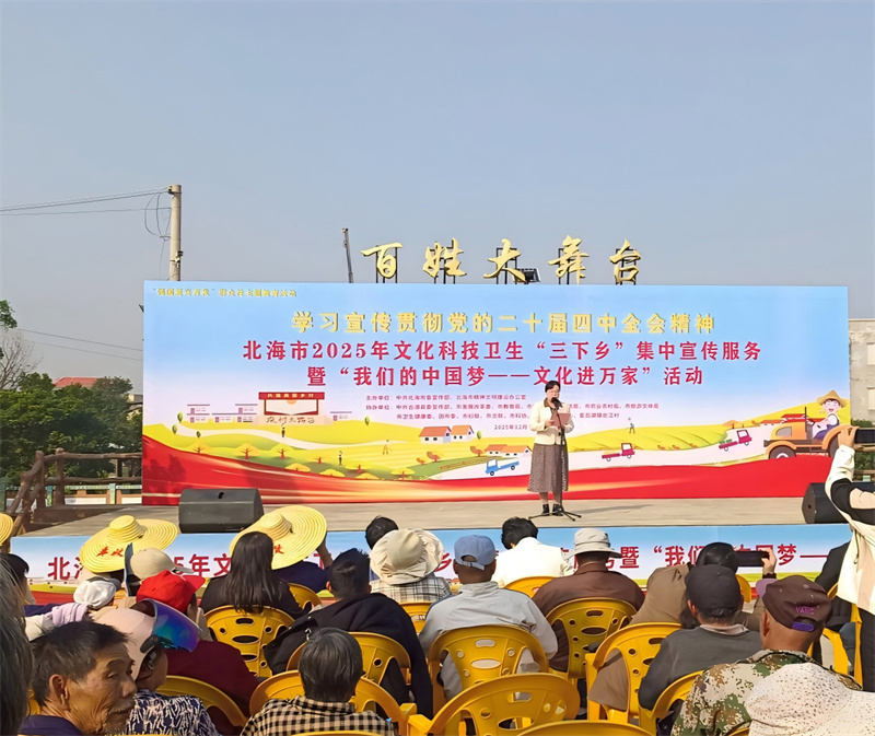 2025年12月30日,由市委宣传部、市文明办主办的北海市2025年文化科技卫生“三下乡”集中宣传服务暨“我们的中国梦———文化进万家”活动在北海市合浦县星岛湖镇总江村马屋广场举行。市图书馆馆长姚小玲带领市图书馆文化志愿者参加此次活动。