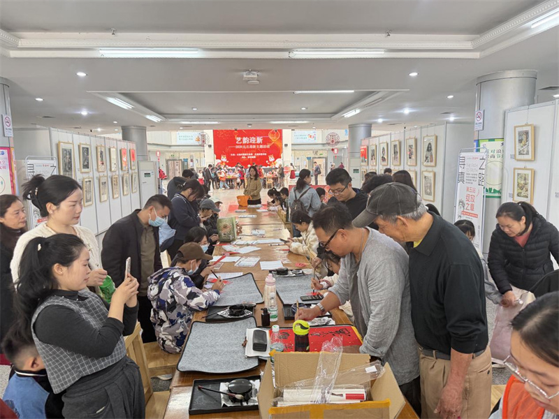 一楼展厅的展览汇集了多种艺术形式的精品佳作,国画的笔墨韵味、水粉画的色彩灵动、素描的线条质感、漫画的鲜活趣味与非遗刺绣的精巧细腻相得益彰。不少市民游客驻足观赏,或轻声交流画作心得,或细细品味非遗刺绣的匠心细节,在笔墨与针线的艺术表达中感受传统文化的深厚底蕴,沉浸式领略艺术之美。