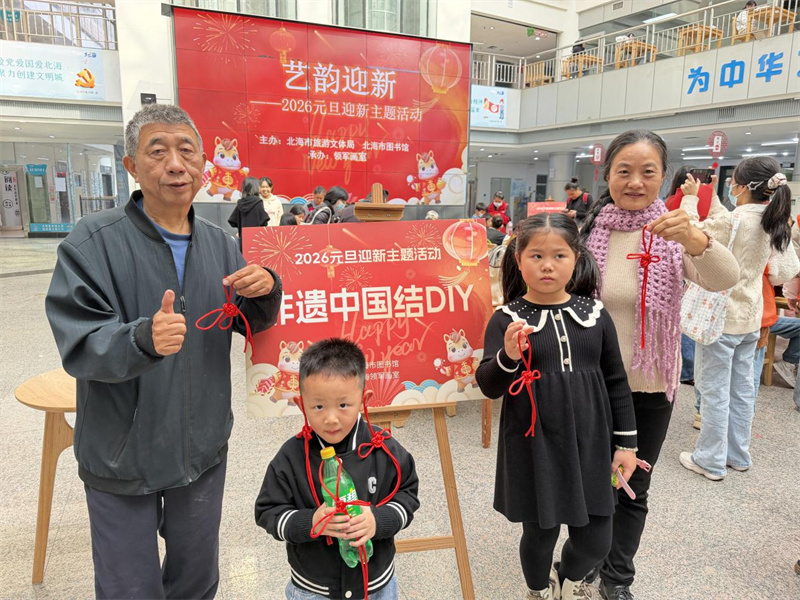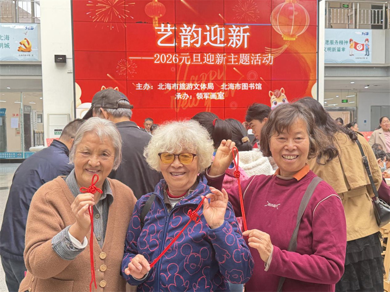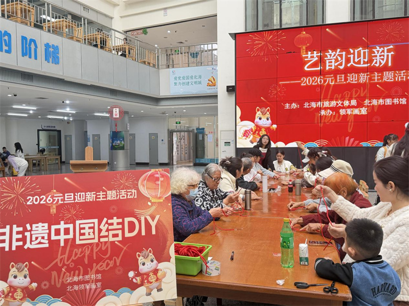 中国结DIY体验区同样热闹非凡。一根根鲜艳的红绳在参与者手中穿梭缠绕,文化志愿者耐心指导大家掌握编结的节奏与手法,参与者们互帮互助,现场氛围温馨和谐。经过一番精心制作,一个个造型饱满、寓意平安喜乐的中国结相继诞生。大家手捧着亲手制作的非遗信物,纷纷表示要将这份承载着千年祝福的礼物珍藏起来,或是送给亲友传递心意。这正是北海市图书馆搭建文化体验平台、让传统民俗走进日常生活的生动实践。