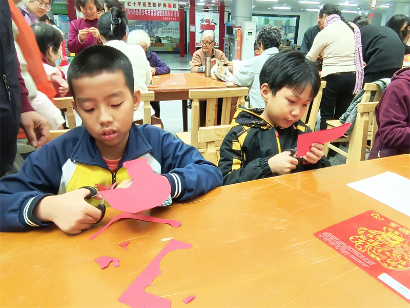 非遗剪纸体验区里,红色的彩纸与锋利的剪刀整齐摆放。文化志愿者讲解了剪纸的基本技巧、新年吉祥纹样的寓意,并指导参与者们上手实践。小朋友们在家长的陪伴下,小心翼翼地转动彩纸、裁剪线条。当一张张精致的剪纸作品完成时,大家纷纷互相展示、拍照留念,将新年的祈愿都凝结在了这方寸红纸之中。