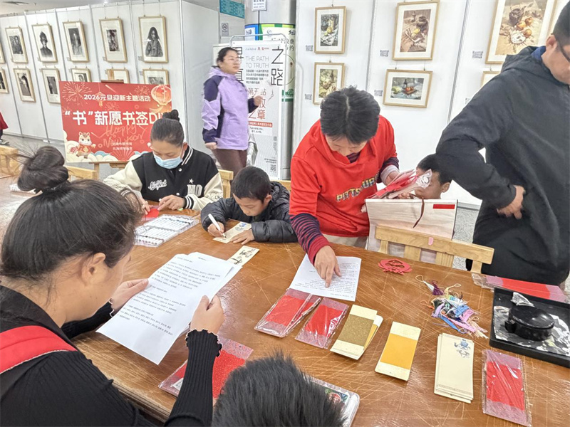 “书”新愿书签DIY体验区则充满了雅致的文艺气息。现场准备了多种雅致的书签材料,参与者们可以自由搭配传统纹样贴纸、进行手绘创作,或是用笔墨写下新年的期许与祝福。有的市民写下“新岁读好书,书香伴成长”的心愿,有的亲子家庭共同绘制了充满童趣的图案,还有的参与者将剪纸作品的边角料巧妙融入书签设计,让传统元素与创意灵感完美融合。参与者李女士高兴地说:“这样的活动既有趣又有意义,不仅让孩子感受到了传统工艺的魅力,也让我们家长重拾了文化温情,希望图书馆今后能多多举办这类接地气、有温度的文化活动。”