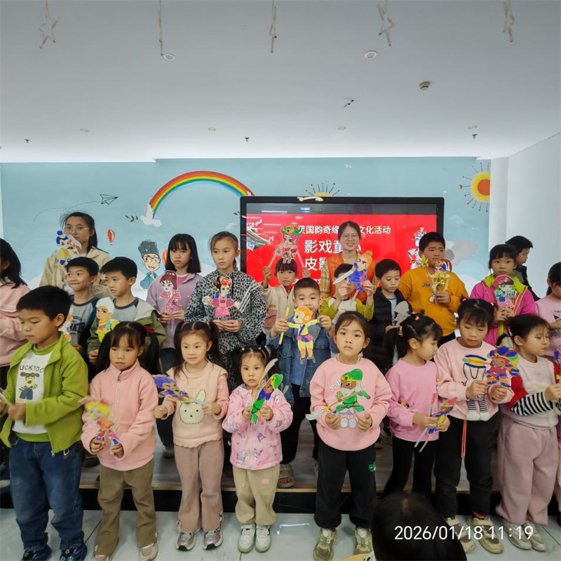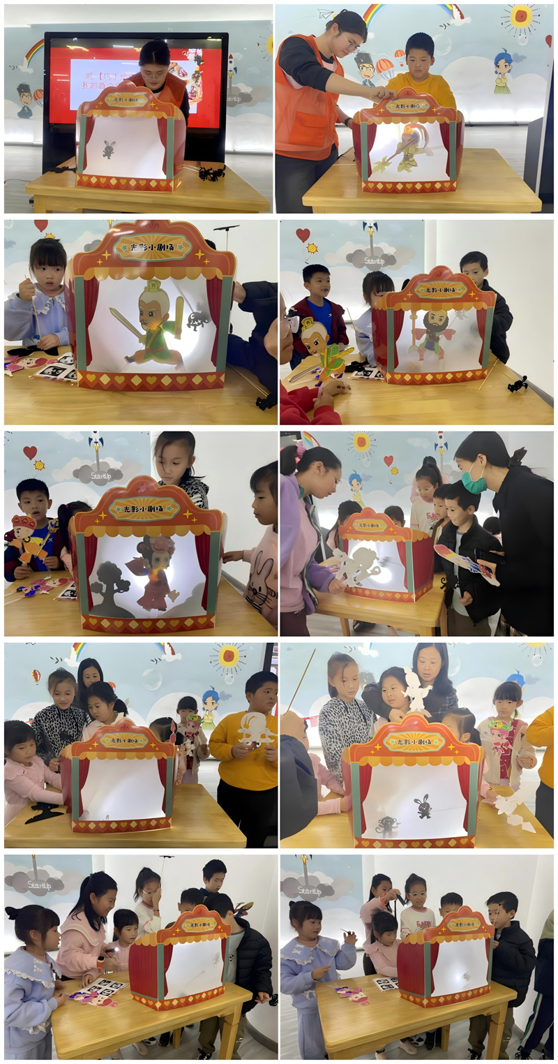 手工制作完成后,“小小皮影剧场”正式开演。孩子们走到白色幕布后,学习操作皮影的基本手法,尝试让人物行走、转身、对话。在简单的编排与协作下,一段段充满童趣的光影小故事跃然“幕”上,现场欢笑声与惊叹声不断。许多家长表示,这是孩子第一次近距离接触并亲手操作皮影,在趣味互动中不仅锻炼了动手与表达能力,更直观感受到了中华传统技艺的精妙。