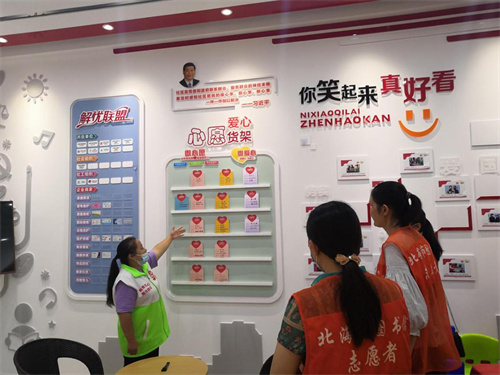 互联共建社区黄崇媚书记向市图书馆党员干部介绍微心愿货架