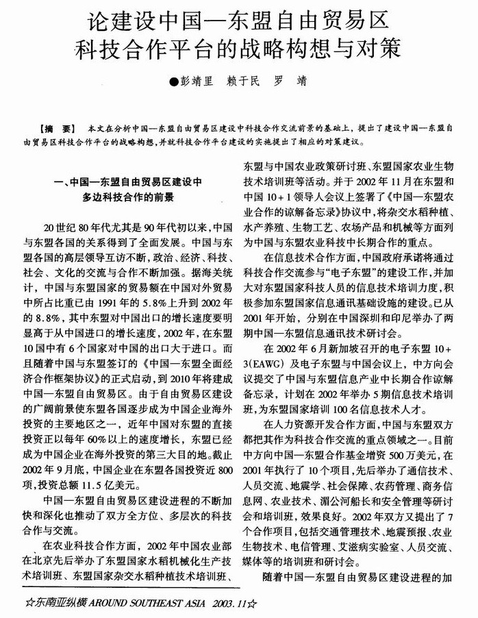 论建设中国-东盟自由贸易区科技合作平台的战略构想与对策