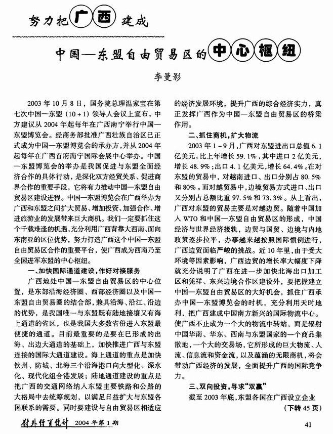 努力把广西建成中国—东盟自由贸易区的中心枢纽