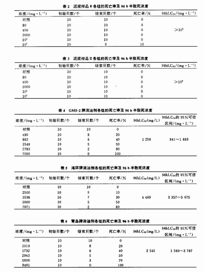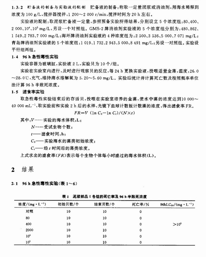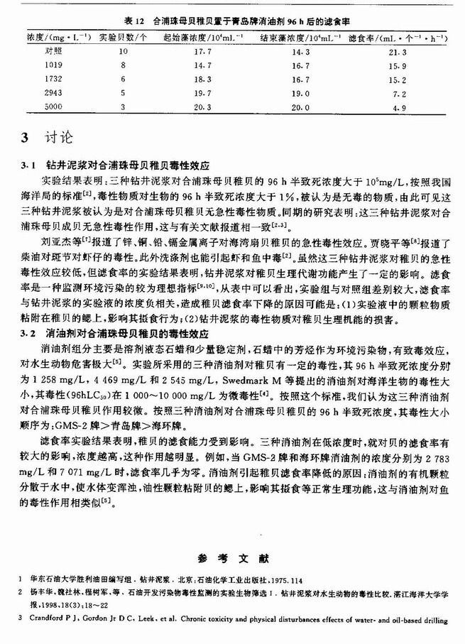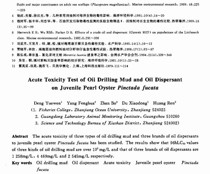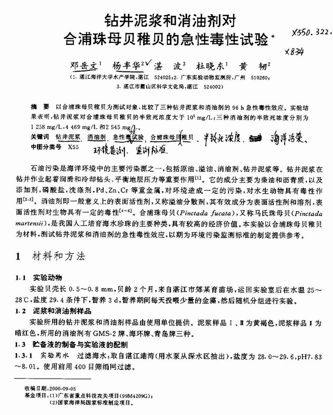 钻井泥浆和消油剂对合浦珠母贝稚贝的急性毒性试验