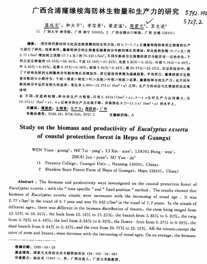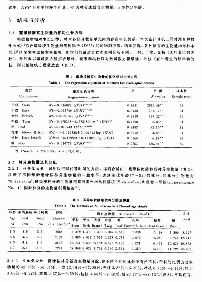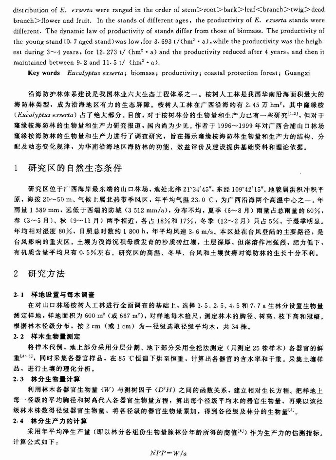 广西合浦窿缘桉海防林生物量和生产力的研究