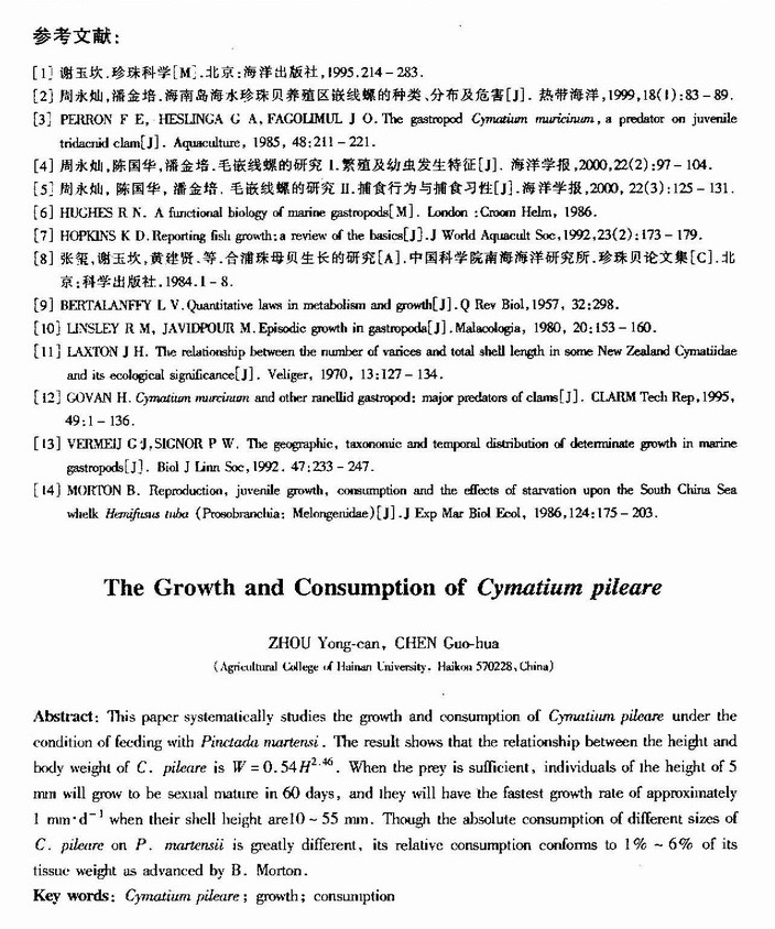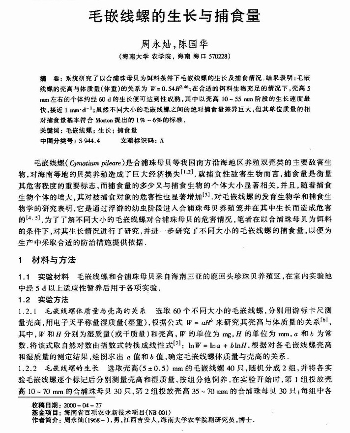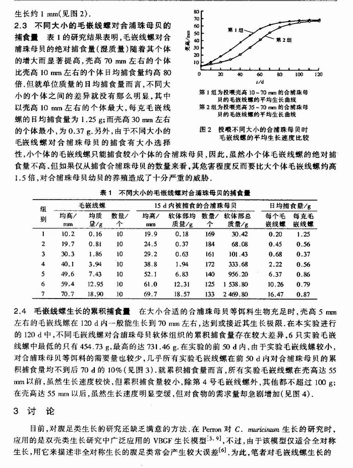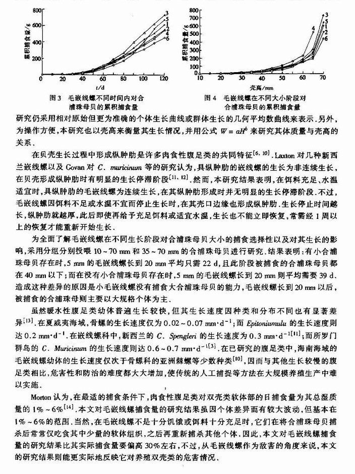 毛嵌线螺的生长与捕食量