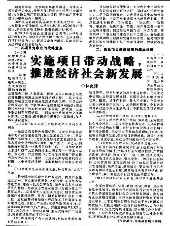 实施项目带动战略,推进经济社会新发展