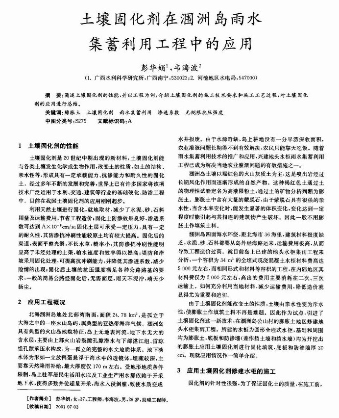 土壤固化剂在涠洲岛雨水集蓄利用工程中的应用