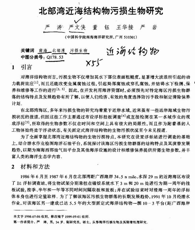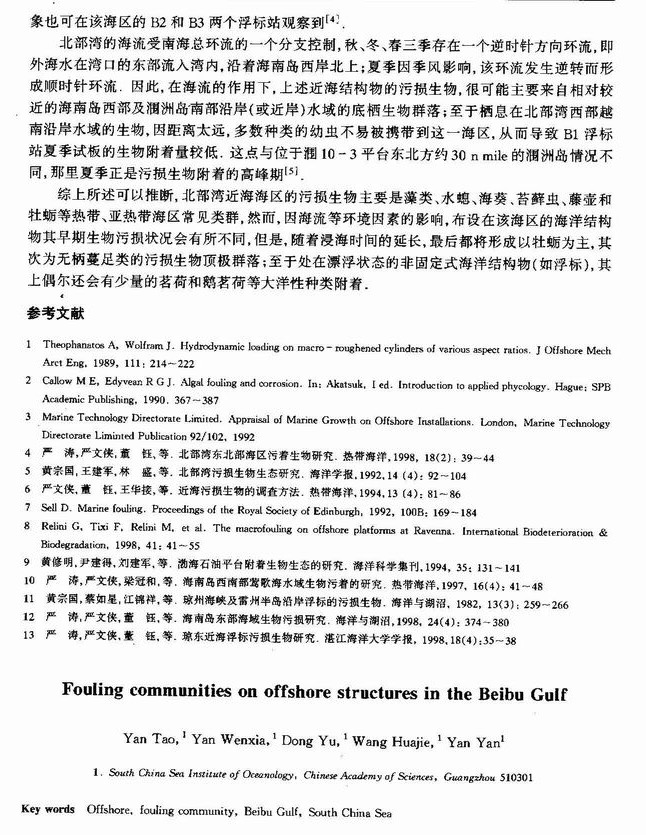 北部湾近海结构物污损生物研究