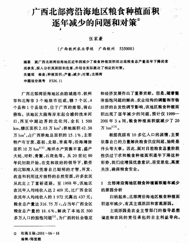 广西北部湾沿海地区粮食种植面积逐年减少的问题和对策