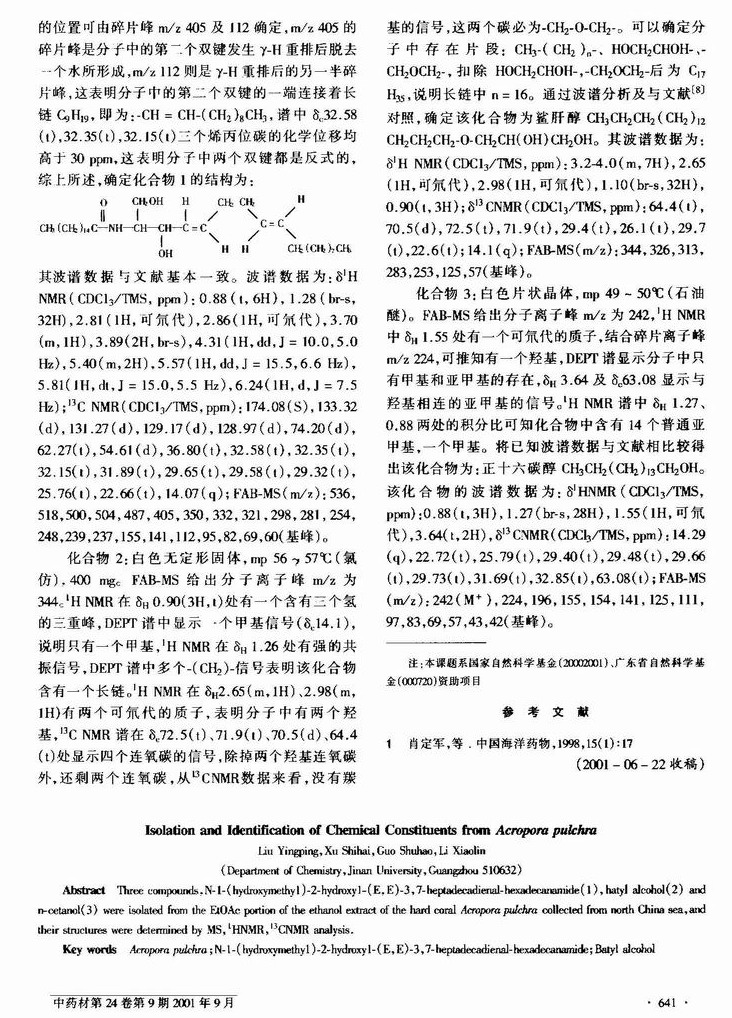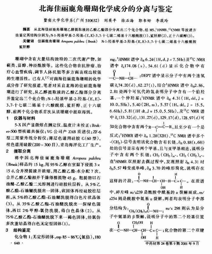 北海佳丽鹿角珊瑚化学成分的分离与鉴定