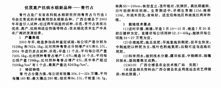 优质高产抗病水稻新品种——青竹占