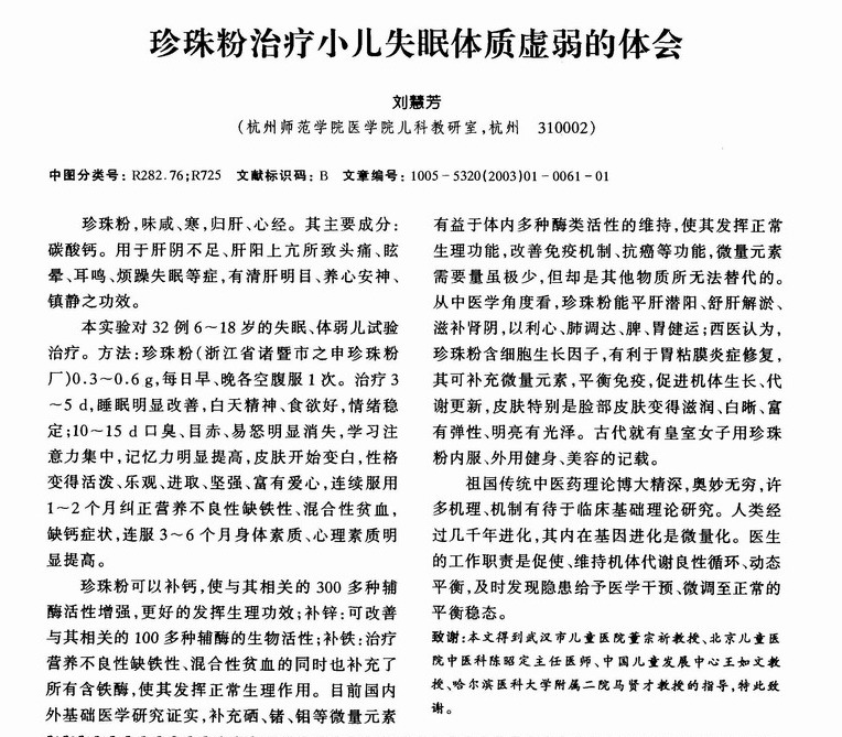 珍珠粉治疗小儿失眠体质虚弱的体会