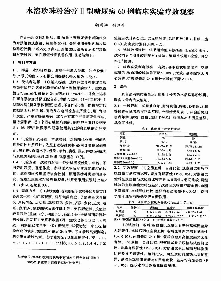 水溶珍珠粉治疗Ⅱ型糖尿病60例临床实验疗效观察