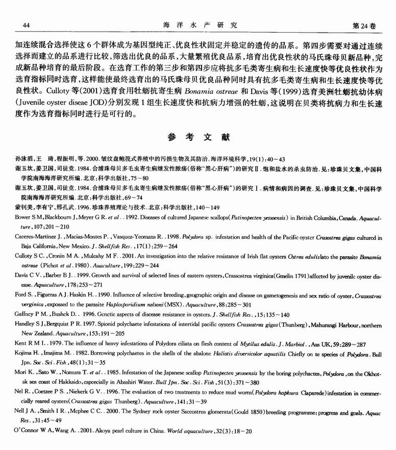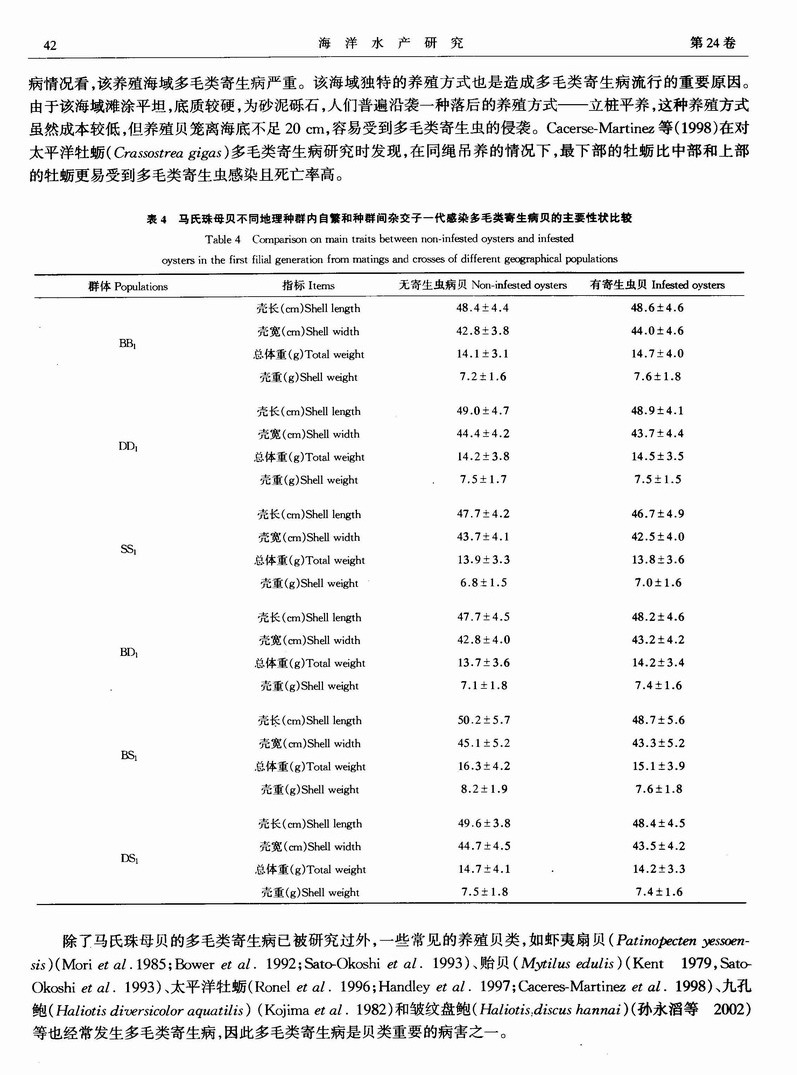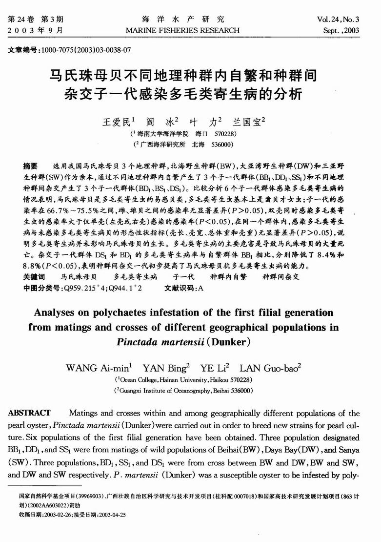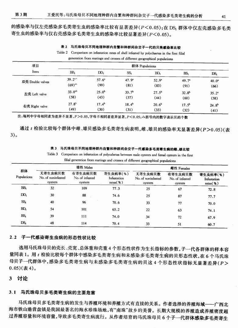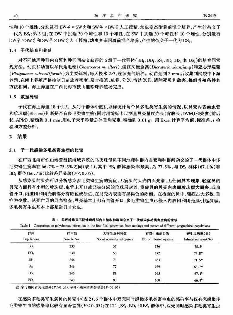 马氏珠母贝不同地理种群内自繁和种群间杂交子一代感染多毛类寄生病的分析