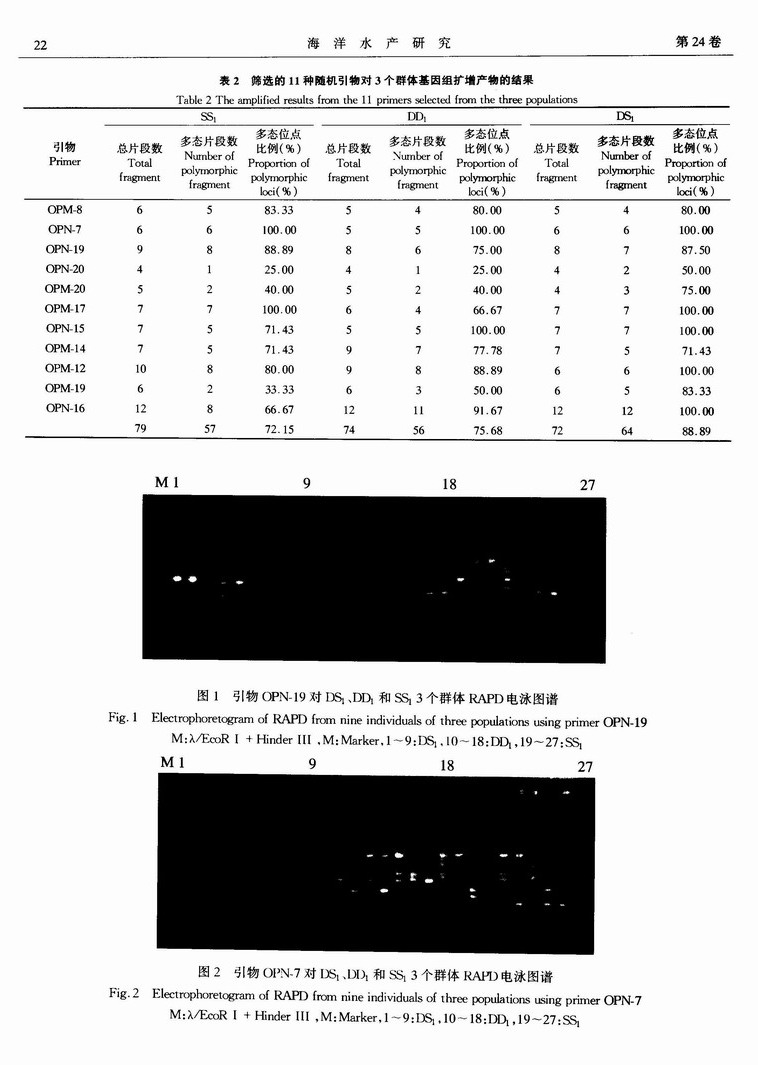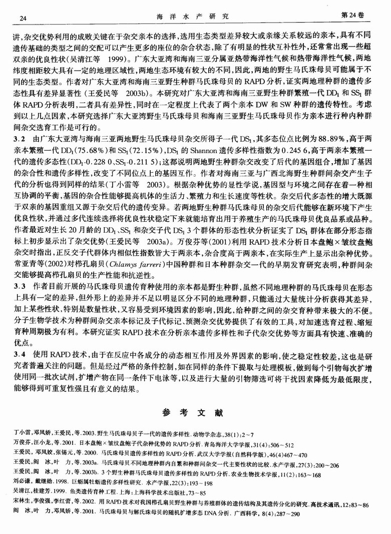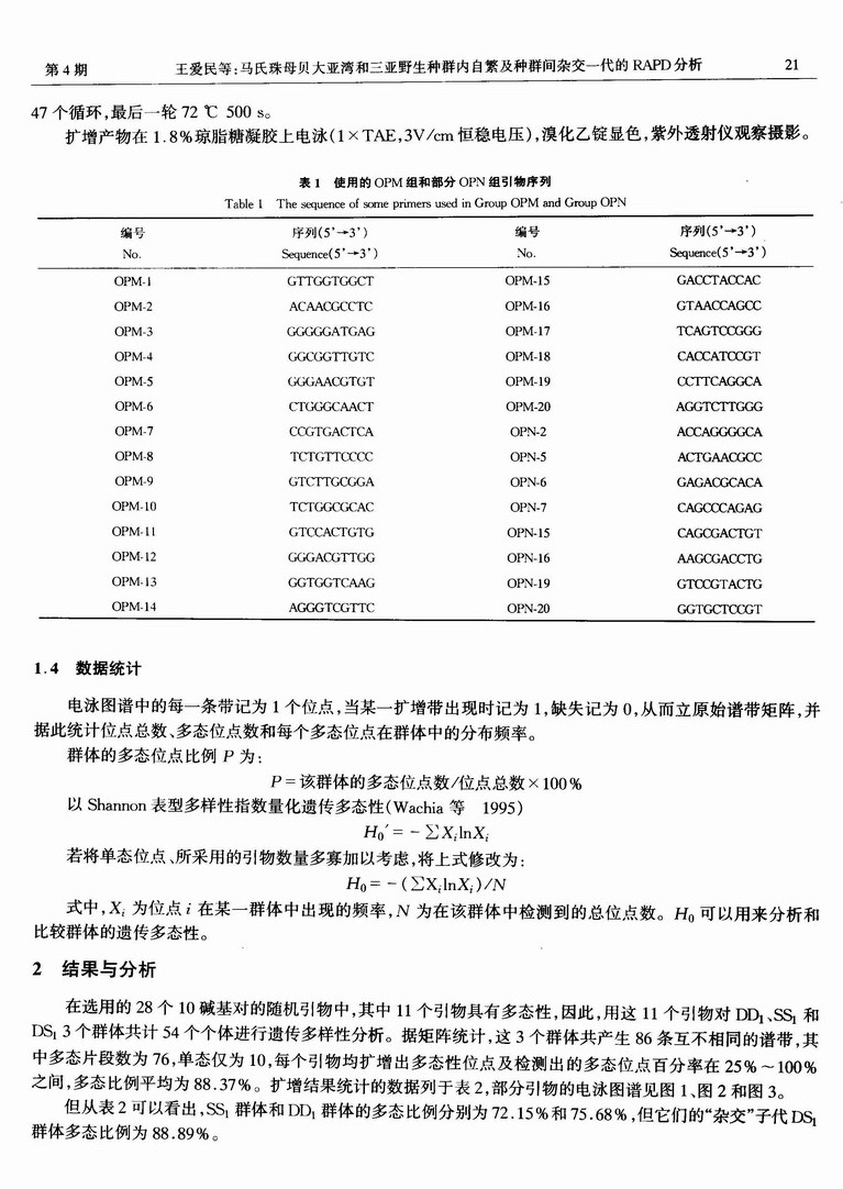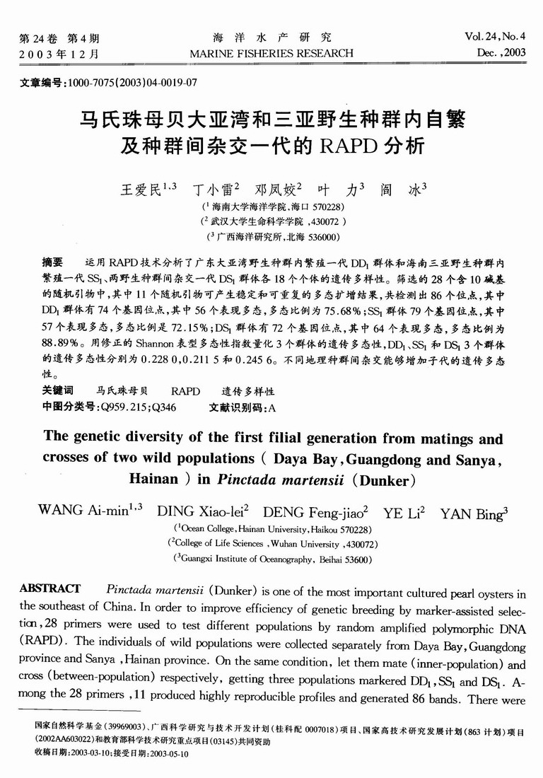 马氏珠母贝大亚湾和三亚野生种群内自繁及种群间杂交一代的RAPD分析
