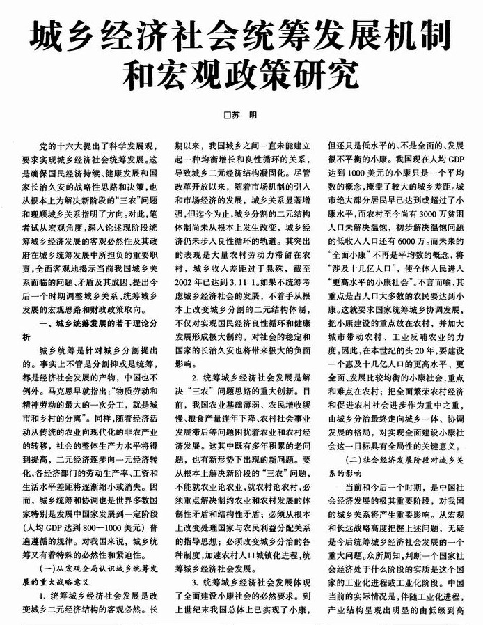 城乡经济社会统筹发展机制和宏观政策研究