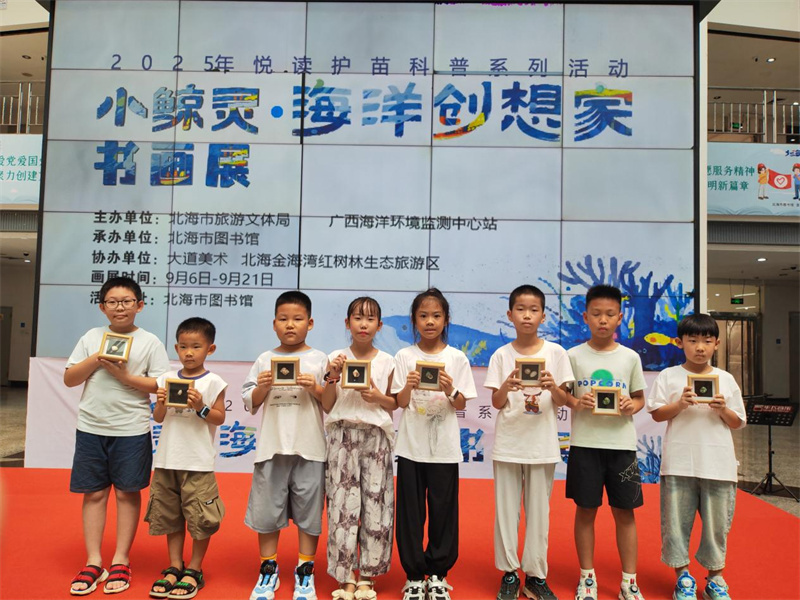 9月6日,由北海市旅游文体局、广西海洋环境监测中心站主办,北海市图书馆承办,大道美术、北海金海湾红树林生态旅游区协办的“小鲸灵·海洋创想家书画展”主题活动,在北海市图书馆一楼温情启幕。该活动依托北海本土海洋文化,是2025年“悦读护苗”科普系列活动的重要组成部分,以传递海洋保护理念、深化海洋科普与跨学科教育、推动教育与文旅融合为核心,通过才艺展演、知识讲解、手工创作与书画赏析等多元形式,将海洋文化之美与生态保护理念深度结合;同时以青少年海洋主题作品为核心,同步推进作品文创化,打造“艺术+海洋+教育”特色平台,为市民朋友们打造了一场兼具观赏性、趣味性与教育性的蓝色文化盛宴。